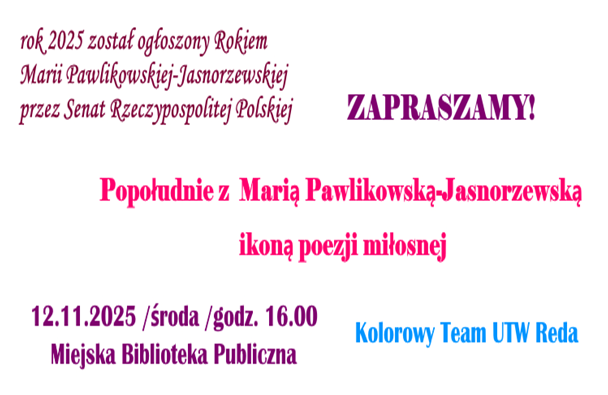 Zapraszamy wraz z Kolorowy Team UTW REDA już w tę środę o 16:00 na spotkanie z poezją Marii Pawlikowskiej-Jasnorzewskiej